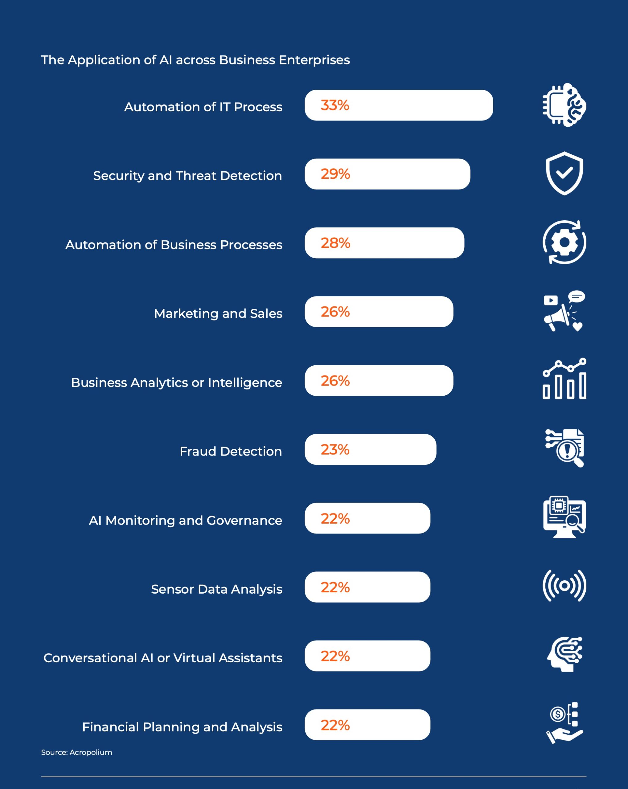 Whilst these examples highlight some of the flagship AI solutions being implemented by multinational organisations, the democratised nature of AI enables small, medium and large enterprises to implement AI-based products, helping to streamline everyday business functions, including accounting, marketing, process automation and recruitment.