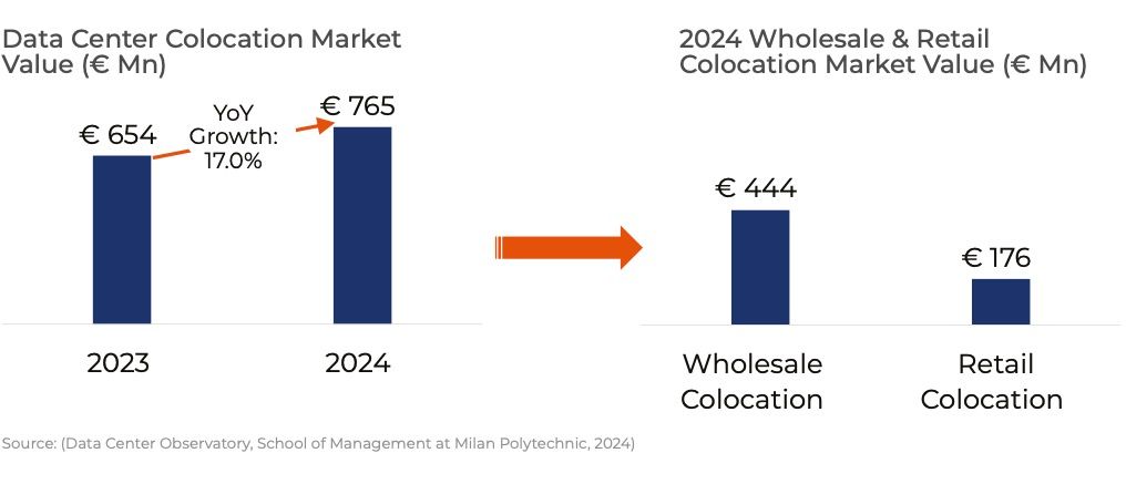 Italy’s colocation market is expanding rapidly, playing a crucial role in the country’s overall data center growth. The segment grew sharply in 2024, reaching an estimated €765.0 Mn ($818.6 Mn), up from €654.0 Mn ($702.6 Mn) in 2023 and €594.0 Mn ($638.1 Mn) in 2022, reflecting steady year-over-year growth. Within the colocation market, the wholesale segment holds the largest share at 58.0%, followed by the retail segment at 23.0%. While hyperscale accounts for just 19.0%, it is poised for significant expansion, driven by Cloud Providers’ development plans, with projections suggesting the market could more than double by 2026 (Data Center Observatory, School of Management at Milan Polytechnic, 2024) (CBRE, 2024). Hyperscalers require large-scale infrastructure for cloud services, and colocation facilities offer the necessary space, power, and connectivity. Leveraging colocation helps reduce capital and operational costs, enables rapid expansion into new regions, and allows hyperscalers to focus on their core business. Colocation also offers scalability and flexibility, enabling capacity adjustments based on demand, making it ideal for efficient global expansion. The colocation market value could more than double by 2025, potentially reaching up to €1.4 Bn ($1.5 Bn). Conservative estimates place it between €1.0 Bn ($1.1 Bn) and €1.4 Bn ($1.5 Bn) by 2025, implying a CAGR of 24.0% to 46.0% (Data Center Observatory, School of Management at Milan Polytechnic, 2024).