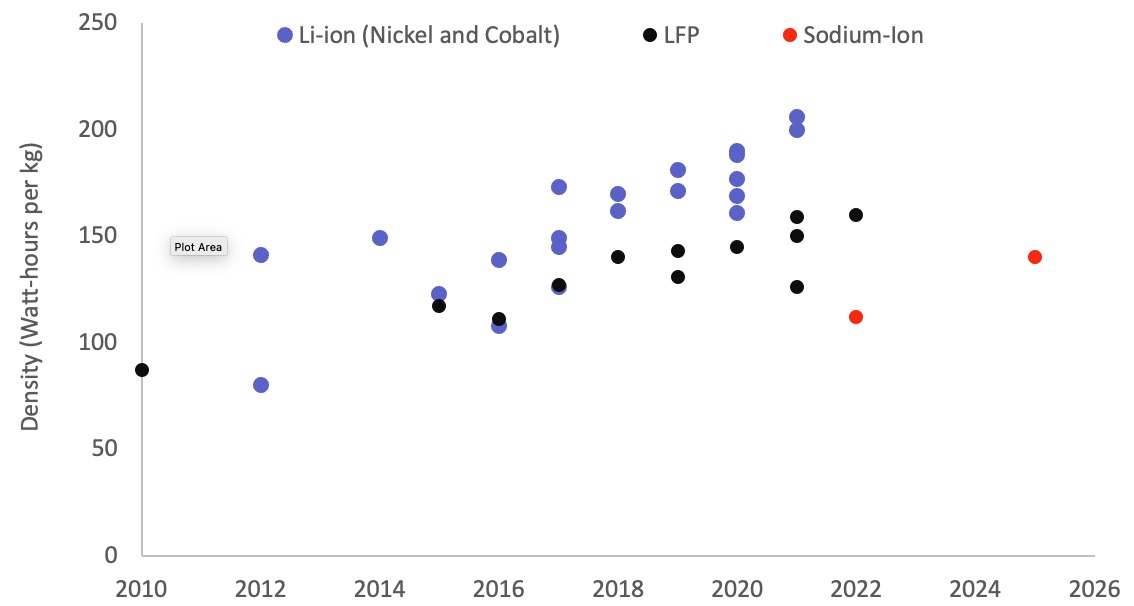 Early production estimates suggest a steady improvement in battery density, with Northvolt reporting over 160 watt-hours/kg in energy density for Na-ion batteries. Trend data indicates that by 2022, the energy density of Na-ion batteries was approaching the level of lower-end Lithium-ion batteries in 2012 MIT Technology Review, 2023). However, it’s important to note that the scale and learning curve advantages of Lithium-ion batteries have been relatively higher due to their larger production base.