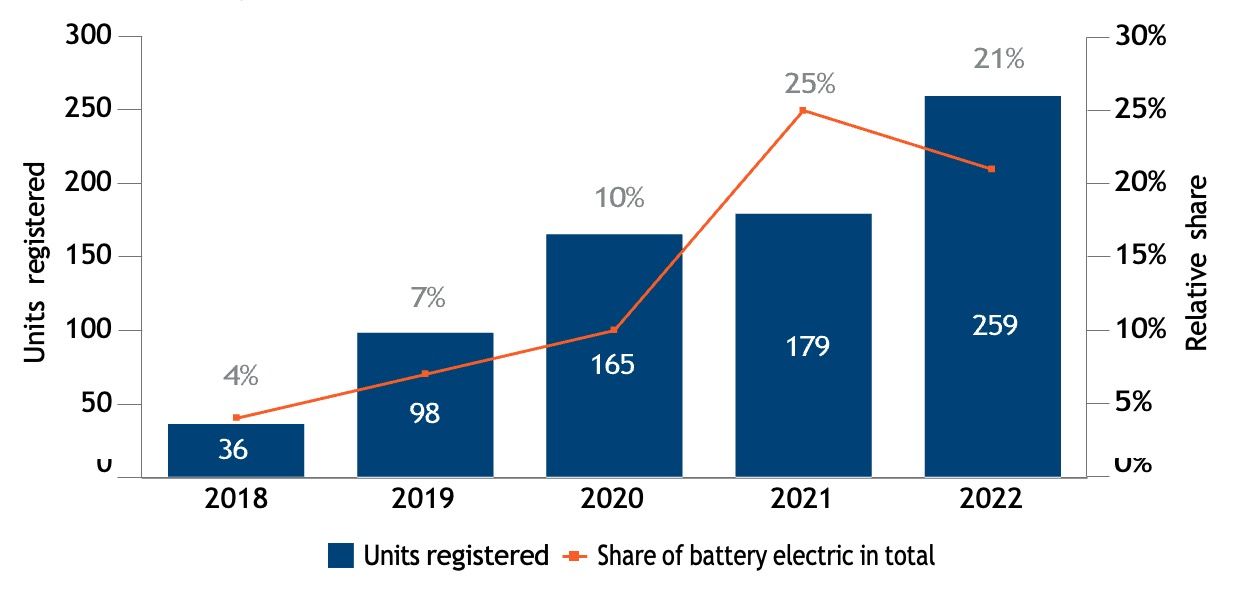 The commercial segment of the electric vehicle market is comparatively smaller in absolute sales terms. The growth, however, is sharp, picking up from the low base. With rapid procurement orders, the new electric bus registrations reported a CAGR of 64% during 2018-2022. Electrification is still insignificant (6.4%) in the total bus fleet of 14,239 units. The spike in new diesel bus registration caused a dip in the relative share of electric bus registration in 2022. Increasingly, with new diesel buses complying with stringent European emission norms, diesel powertrains remain in contention for the operators. The growth spike is sharper for electric trucks (over 3.5 tonnes). A steady stream of orders vastly expanded the total fleet – from just four units in 2018 to 231 by the end of 2022.