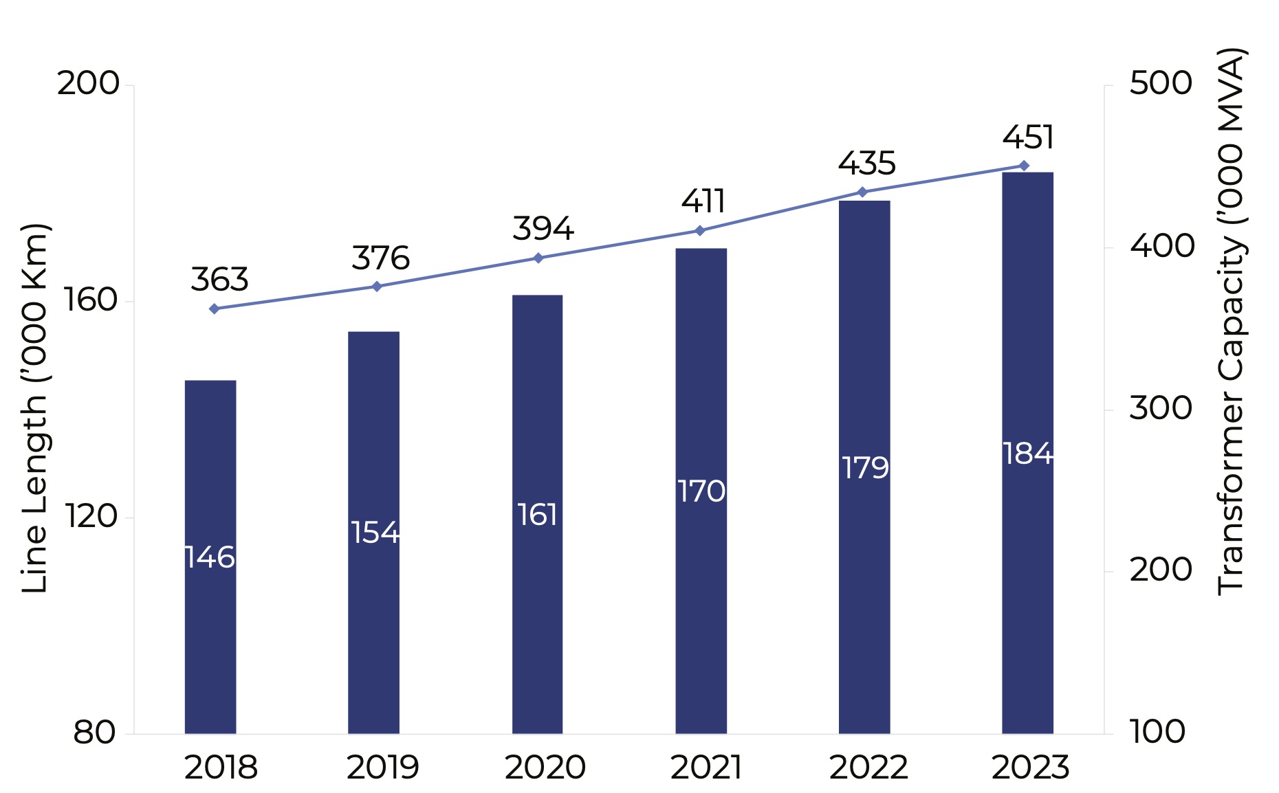 Over three-quarters of the transmission line length is concentrated at voltage ratings of 230kV and 500kV. A major area of focus is the long-distance HVDC-based transmission segments to enable the offtake from the remotely located renewable-rich locations. The auction-based independent transmission model has helped drive the investments. During the period 2018-2023, the line length grew at a compound annual growth rate (CAGR) of 4.4%. The pipeline continues to grow, with several HVDC lines in the works.