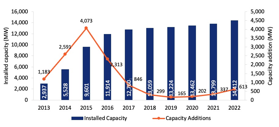 Solar PV installed capacity has posted a CAGR of 19% since 2013. Post Covid-19, the market has shown resilience and is growing in capacity addition ever since. High electricity prices due to inflation and a significant dip in the prices of solar panels have helped in the promotion of solar PV usage in the region. The sectoral growth in 2022 is particularly attributed to the Russia-Ukraine war crisis. The energy crisis has propelled the adoption rate of solar PV in order to ensure energy security and reduce dependence on imported coal or gas for energy generation.