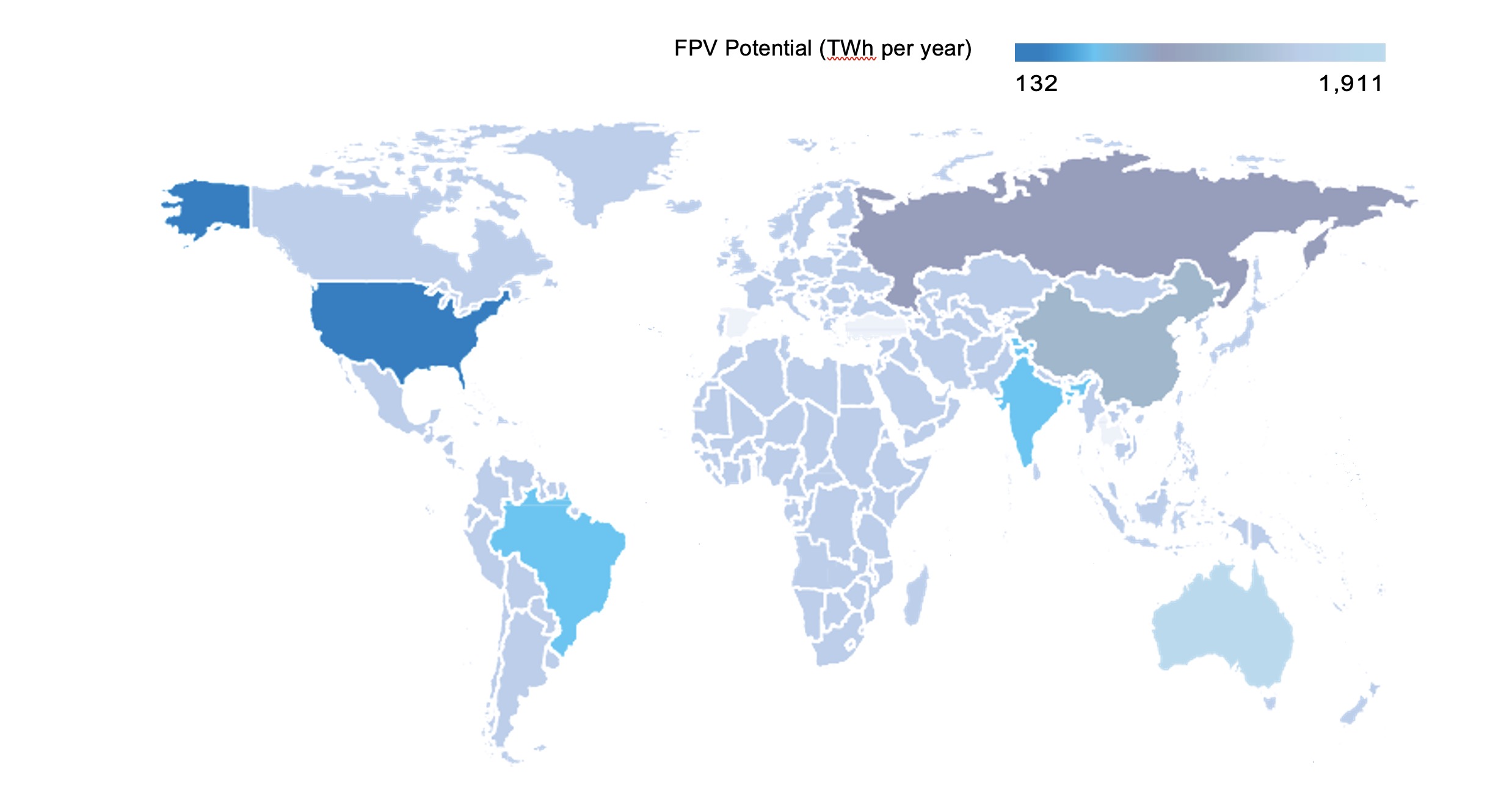 The quest for cost-effective solar power generation has also motivated a rising new form of solar PV capacity known as floating solar PV. This refers to solar PV generation based on floating platforms situated on water reservoirs (including dams of hydropower facilities). In March 2023, an international group of researchers published their research findings on untapped energy potential from floating solar PV. It revealed an annual generation potential worth 9,434TWh from global reservoirs, with only 30% of their area covered. The top four countries in this regard are the US, China, Brazil and India. Significantly, the study demonstrated that in 40 countries, the potential generation from floating solar PV exceeds their total existing power demand.
