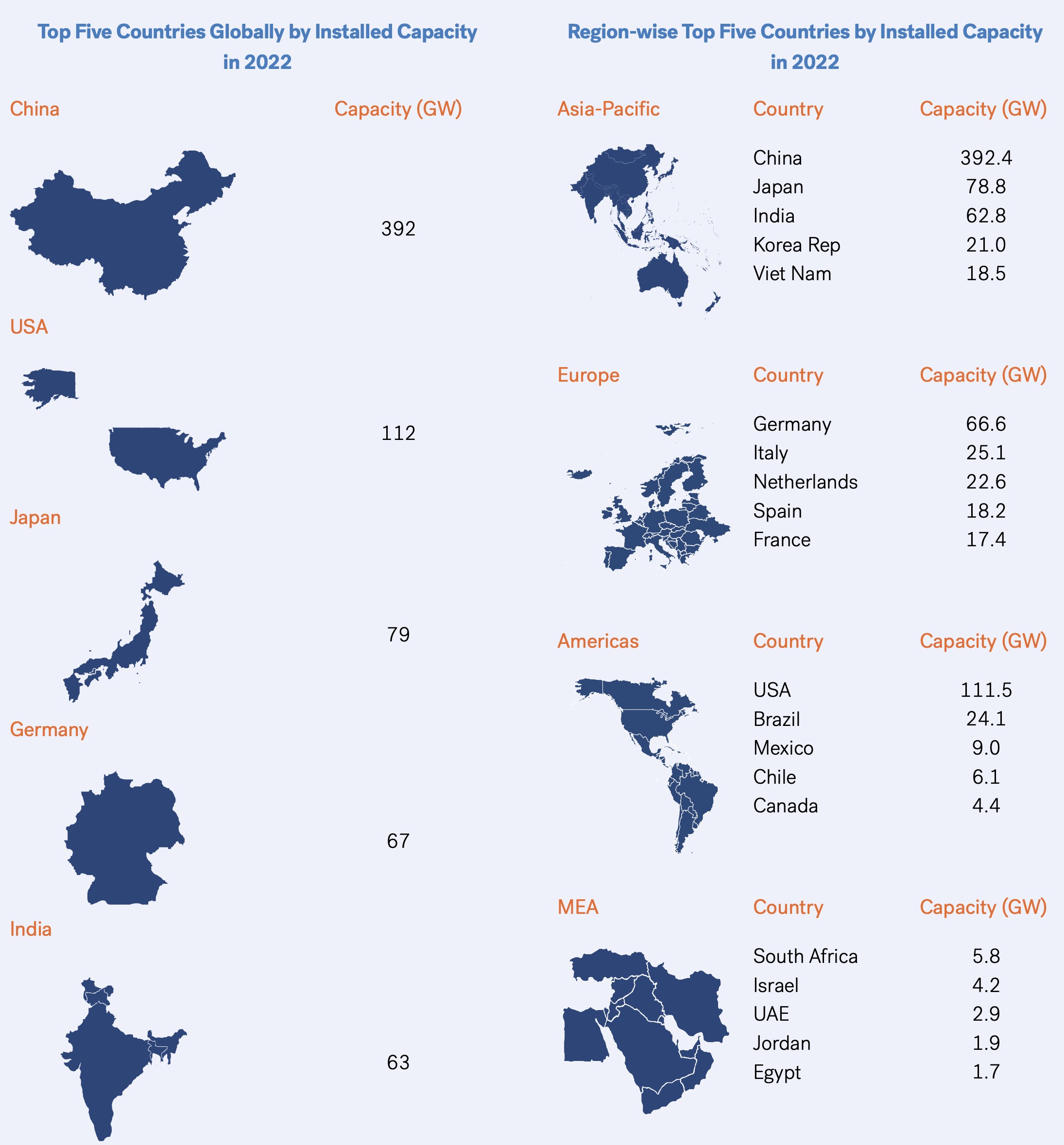 In other markets, however, the utility-scale solar PV segment continues to be the driving force for growth. This is the case for the US market, which ranks second after China in installed solar PV capacity. The market faced some headwinds that impacted capacity additions, with a 19% year-on-year growth in 2022, compared to an average of 25% in the previous two years. Trade restrictions on imported solar modules, especially those from China, played a significant role in disrupting planned capacities.