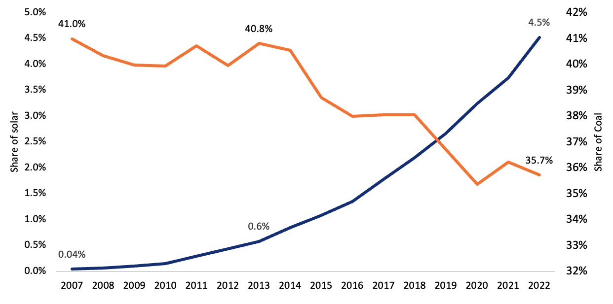 Global Share of Solar Power against Coal in Total Electricity Generation