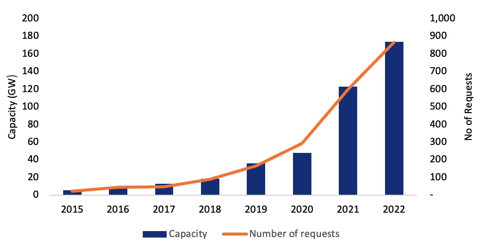 Note: Data on grid interconnection requests just indicative of developers’ interest but does not imply actual capacity addition