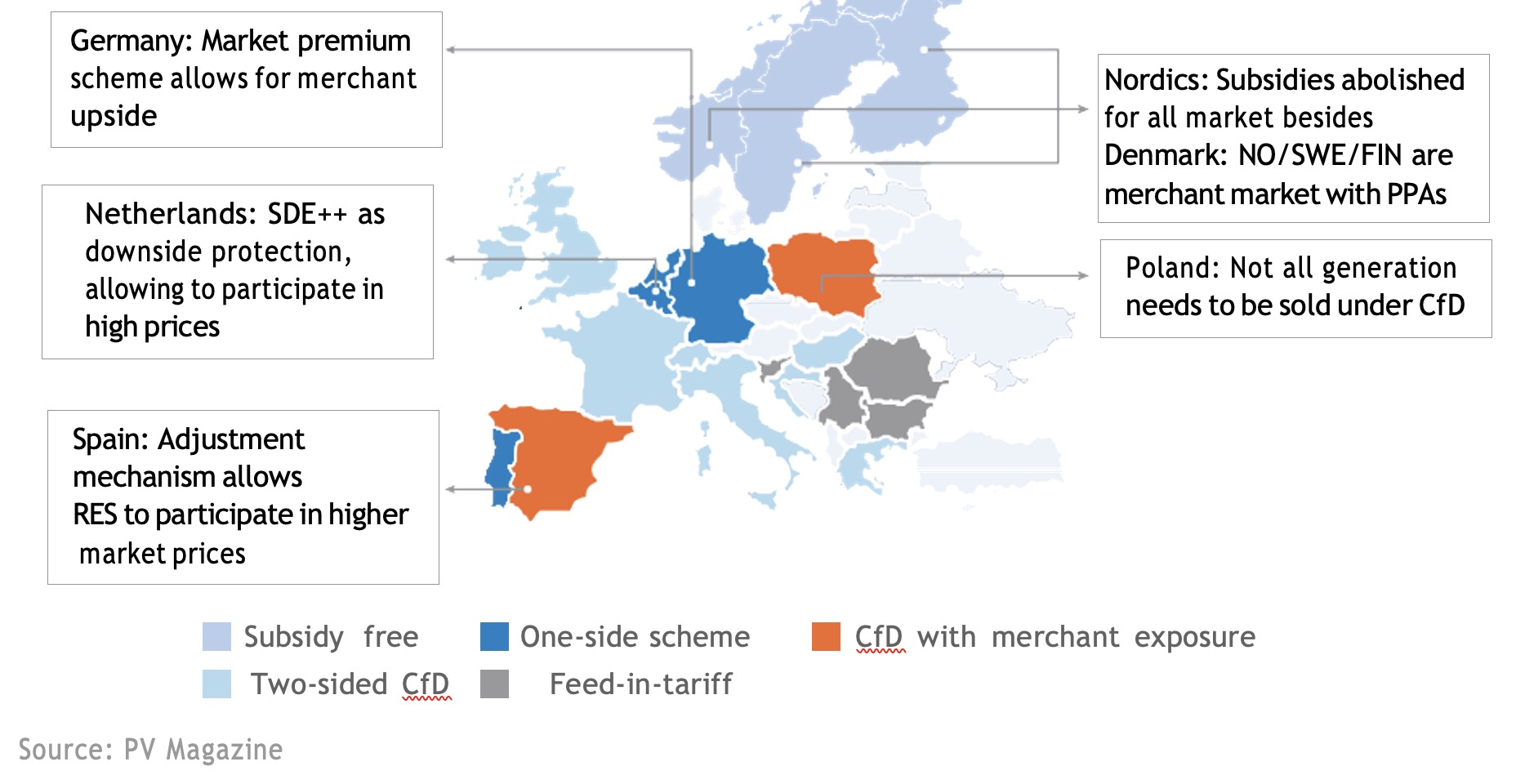 The European market, primarily driven by the policy-led growth in capacity and the related support structures, also accommodates the potential for the merchant power segment. Select markets such as those of the Nordics are examples of prominent merchant PPAs due to the elimination of subsidies. In contrast, other markets have CfDs, which could act against the incentives for PPAs and may, effectively, displace the capacity that would otherwise be allocated through merchant or other direct offtake-based PPAs.