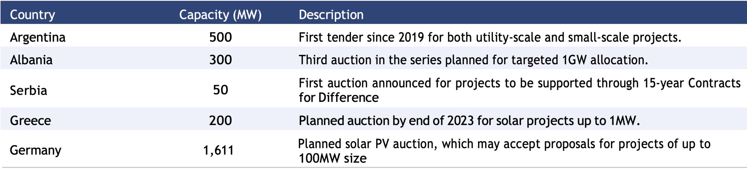 The volatility in the energy wholesale markets during 2022, together with other challenges such as the rise in inflation rate, interest rates, and equipment costs, impacted the auctions. Many of them closed under-subscribed. Lower ceiling prices in the auctions, especially when compared to the corporate PPAs or the merchant segment, make the incentives weaker. A recent example in point is the Spanish auction, which as of November 2022, went largely unsubscribed for 3,000MW worth of solar PV capacity on offer. Yet, it appears that the dampened sentiment in auctions may gradually turn a corner. In June 2023, Germany’s solar PV auction was marginally over-subscribed, with final average price at $0.077/kWh. France similarly reported an oversubscribed 172MW worth of auction-based allocation in January 2023.