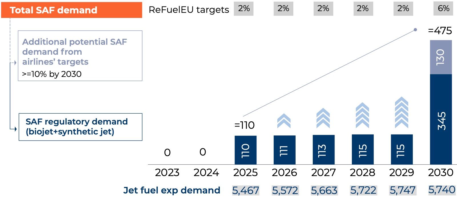 SAF, with its potential to play a relevant role in decarbonizing the aviation sector, is expected to rapidly scale up, supported by regulations. SAF incorporation targets have been set at 2.0% yearly between 2025-29 and 6.0% in 2030, in line with ReFuelEU (Roland Berger, 2024).