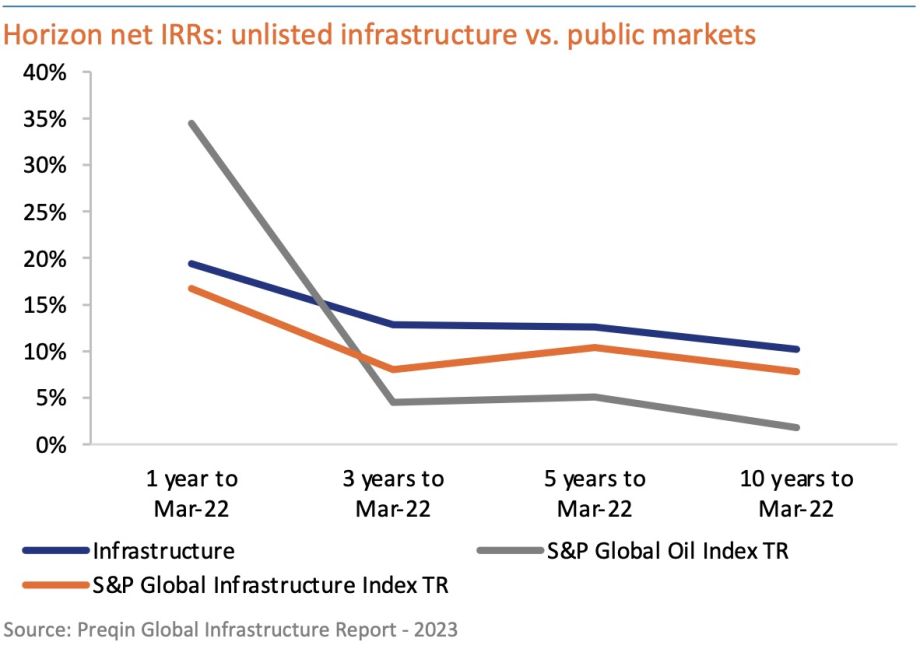 Infrastructure’s one-year net IRR to Q1 2022 was 19.4%. This still includes recovery from the impact of COVID-19 and will have waned somewhat since, as the economic climate bears down