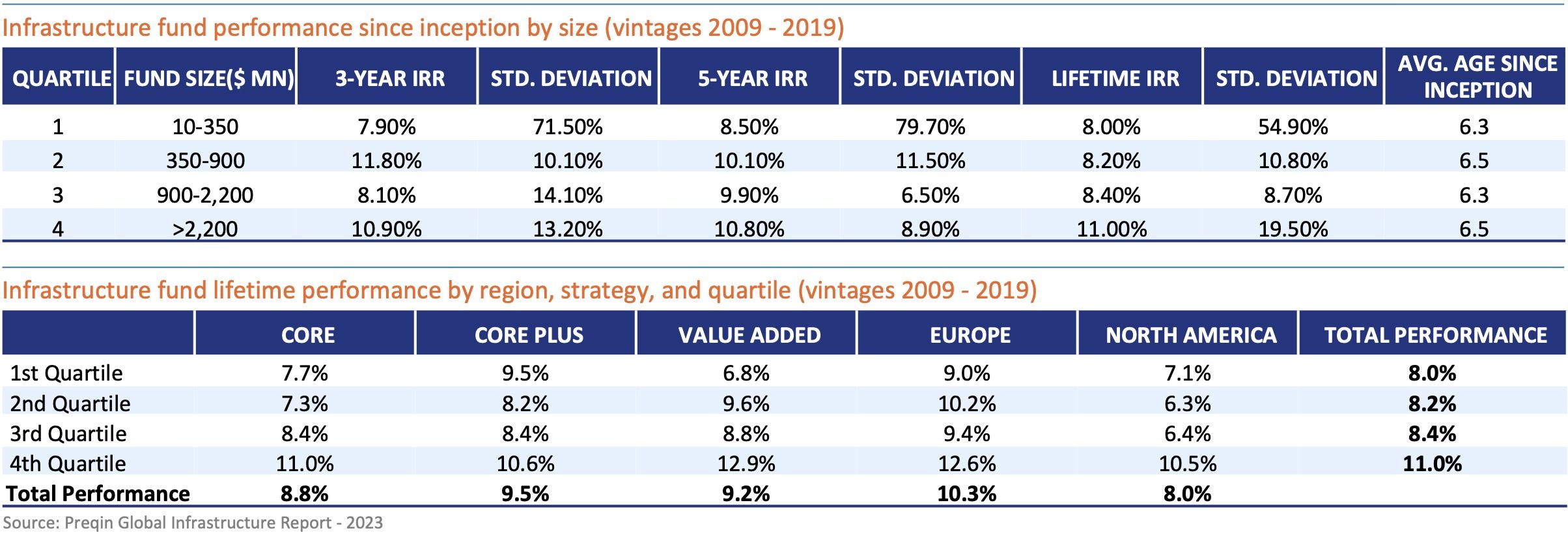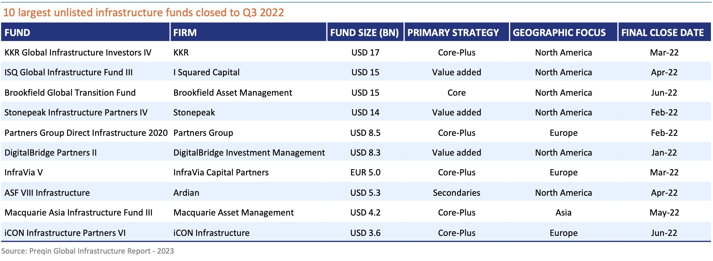 In terms of total capital raised, the top 10 unlisted infrastructure funds have historically been responsible for the lion’s share and the trend continues. Until Q3 2022, 70% of the total capital raised has been allocated to the top 10 infrastructure funds