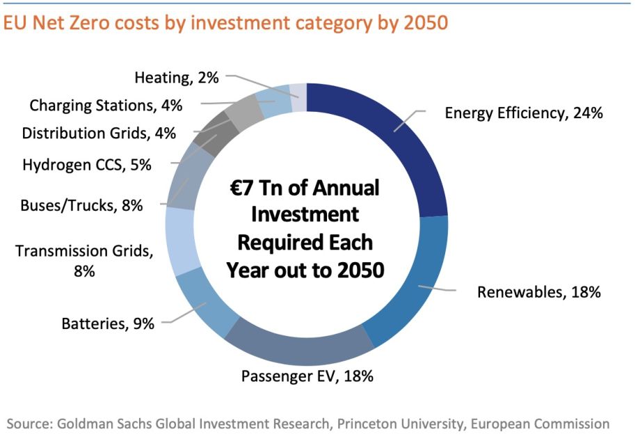 As per Goldman Sachs Research and FactSet, Half of this $6 trillion annual investments is needed for decarbonization to be on path for Net Zero by 2050. There is a need for $1.8 trillion of annual incremental decarbonization investment in the 2020s and $1.0 trillion for infrastructure/water