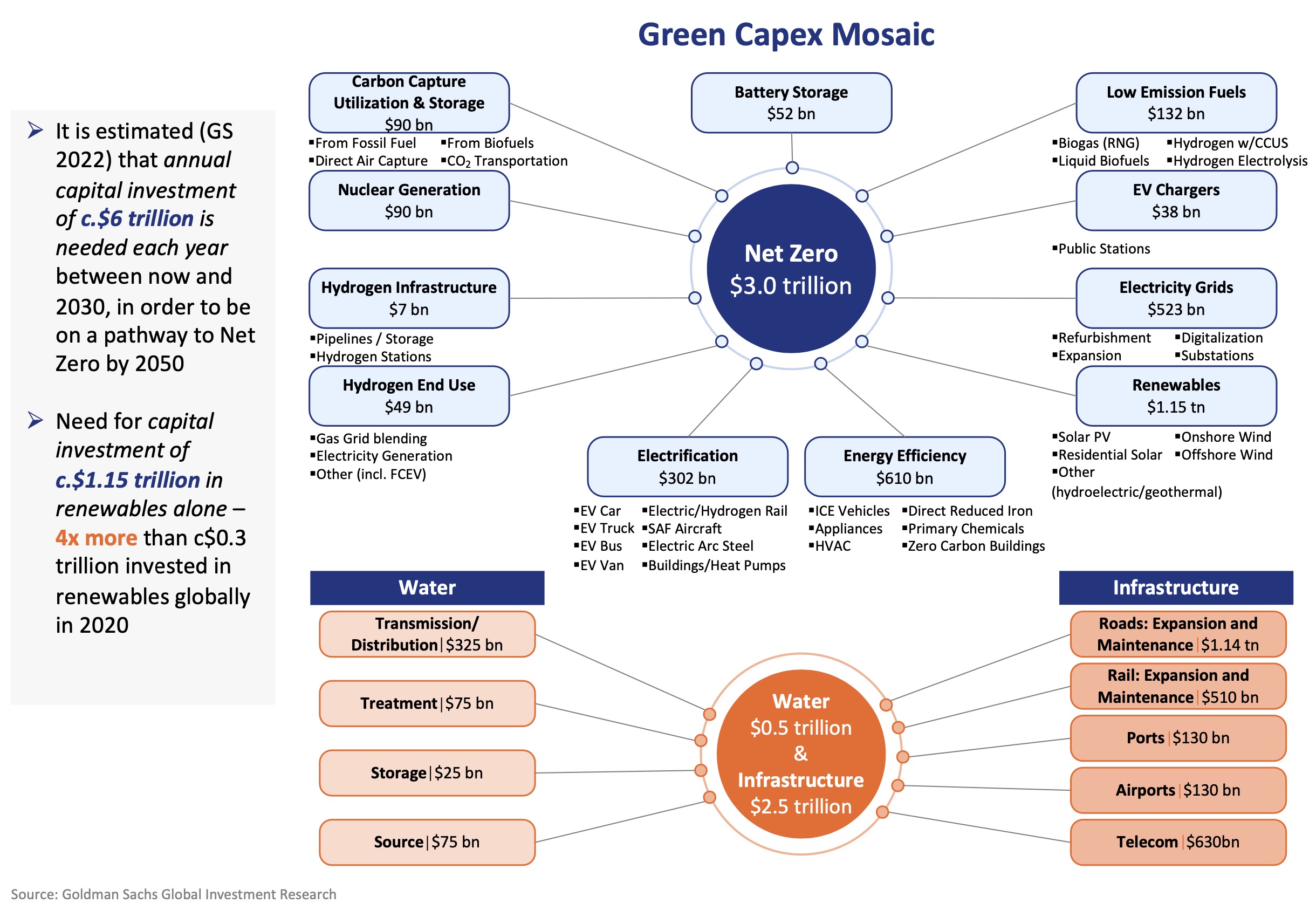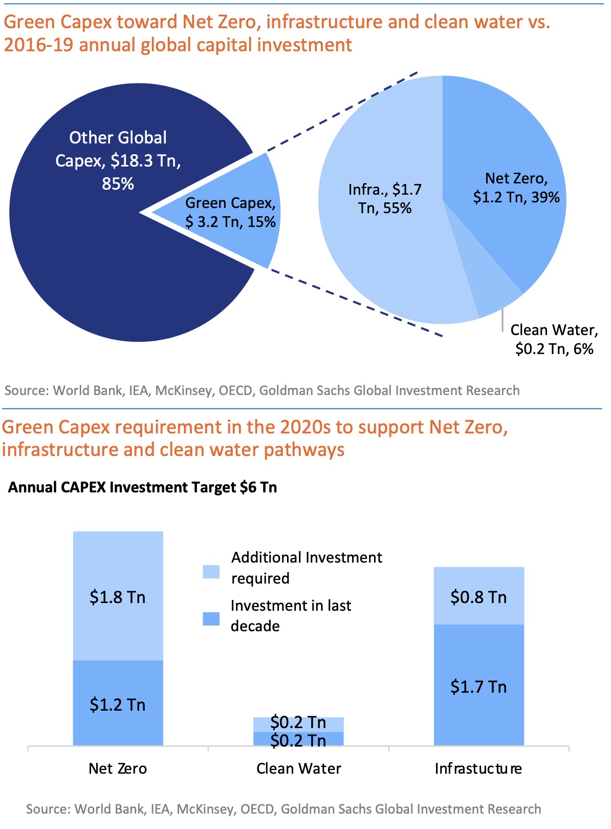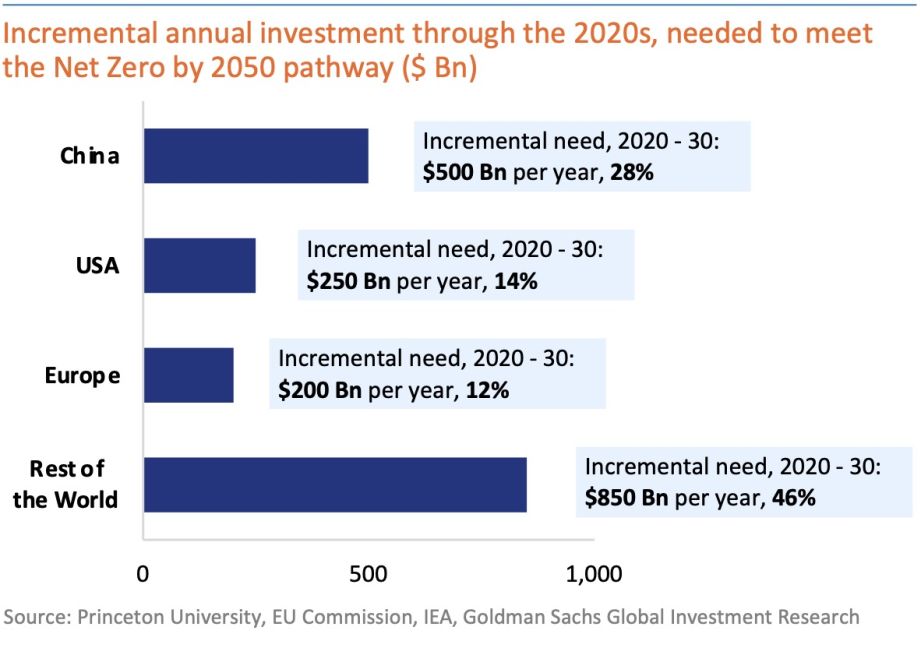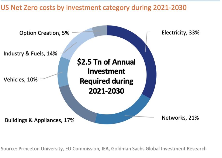 As per Goldman Sachs Research and FactSet, Half of this $6 trillion annual investments is needed for decarbonization to be on path for Net Zero by 2050. There is a need for $1.8 trillion of annual incremental decarbonization investment in the 2020s and $1.0 trillion for infrastructure/water