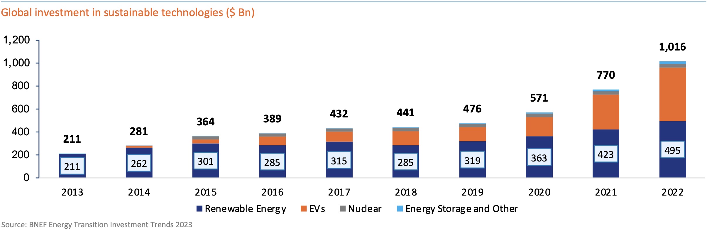 In terms of technology, the majority of the investments in clean energy were driven by solar and wind, reaching $495 billion, a 17% increase from 2021. Electric vehicles come close second with $466 billion of investment, marking a stiff 54% increase over the previous year