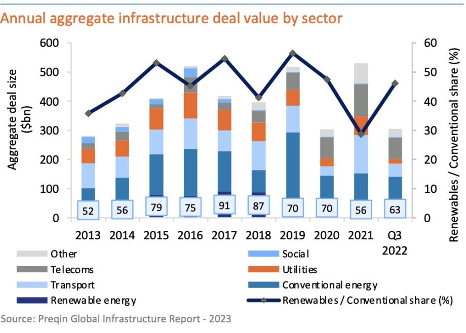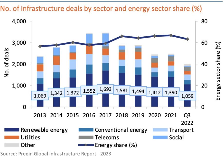 The dominance of energy as an asset class is mainly attributed to a growing number of renewable deals. Although despite their growing share of total deals, they do not absorb nearly as much capital as conventional energy deals