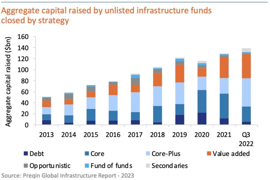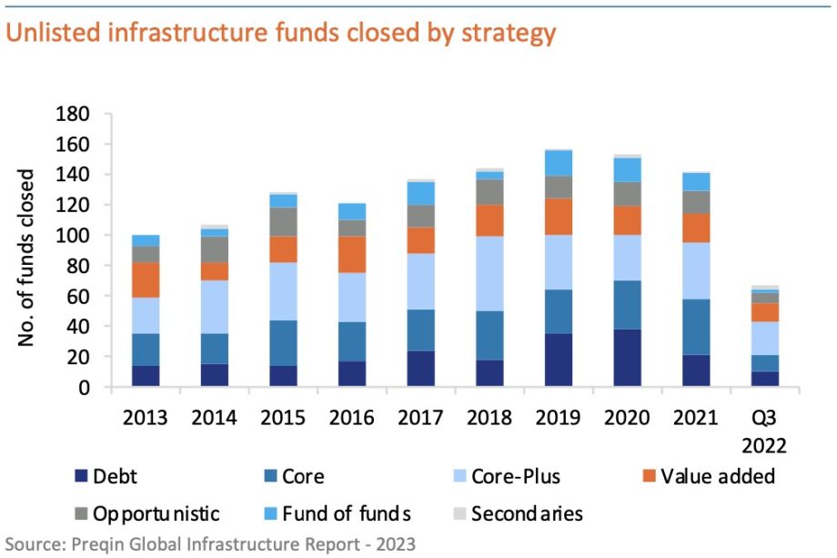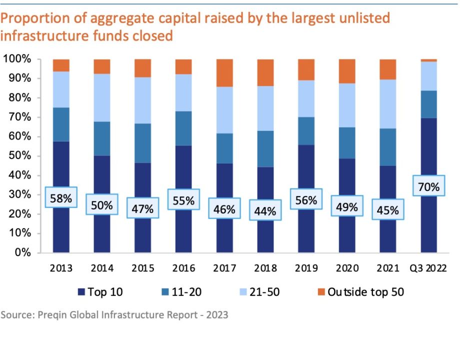 In terms of total capital raised, the top 10 unlisted infrastructure funds have historically been responsible for the lion’s share and the trend continues. Until Q3 2022, 70% of the total capital raised has been allocated to the top 10 infrastructure funds