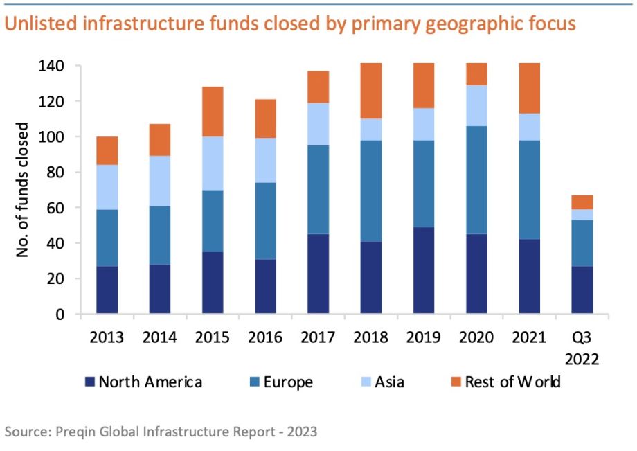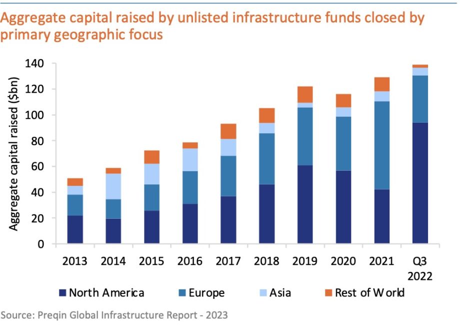 Of the total capital raised by unlisted infrastructure funds until Q3 2022, North America-focused funds held 68% share