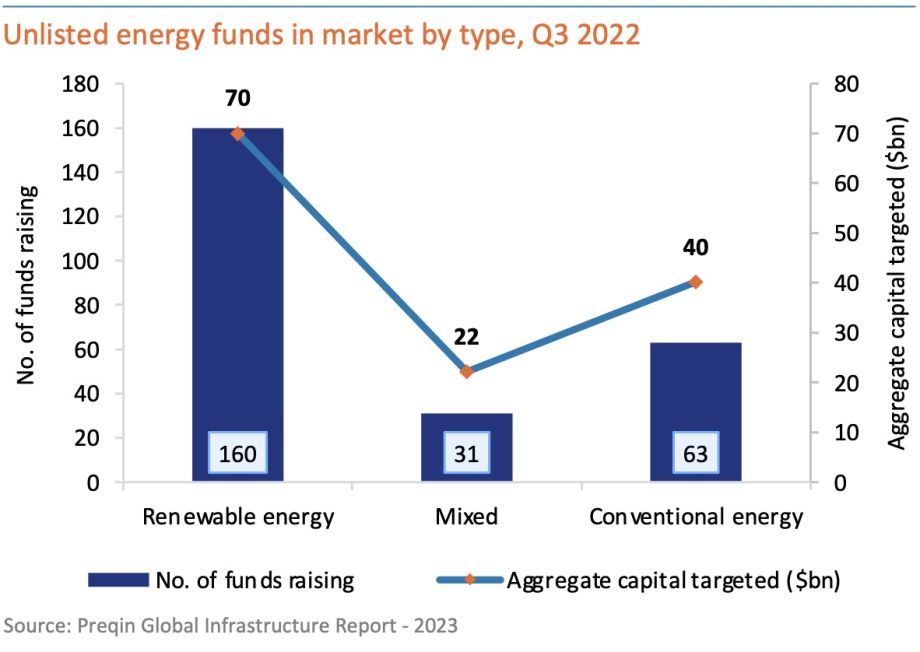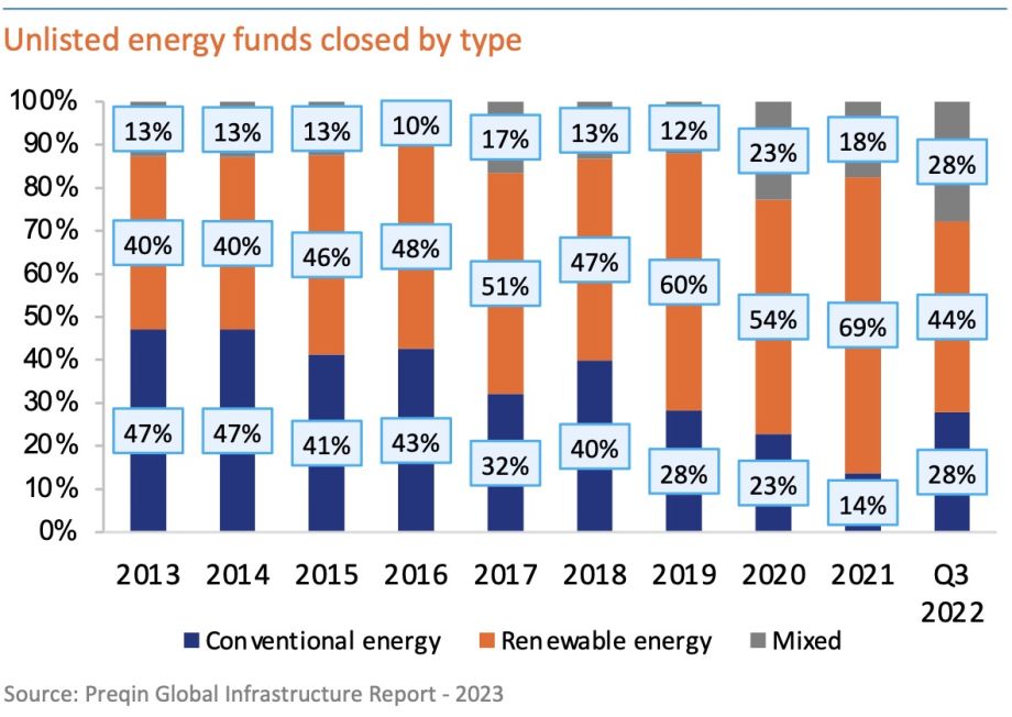 § Investors hoping to green their portfolios toward ESG targets have driven much of this medium-term trend. However, Q3 2022 data on this mix reveals a rebound in commitments to conventional energy funds, with the share of fundraising doubling to 28% compared with 2021. This is in response to higher gas and oil prices and the returns they deliver