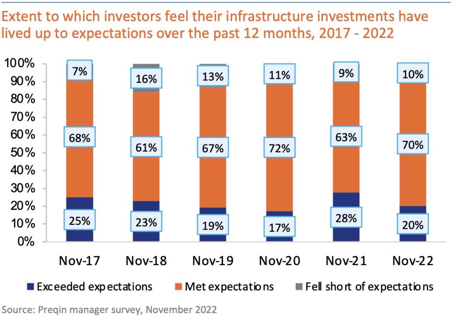 As per Preqin survey, 70% of investors reported their infrastructure investments had lived up to expectations over the past 12 months, slightly higher than the 67% average of 2017