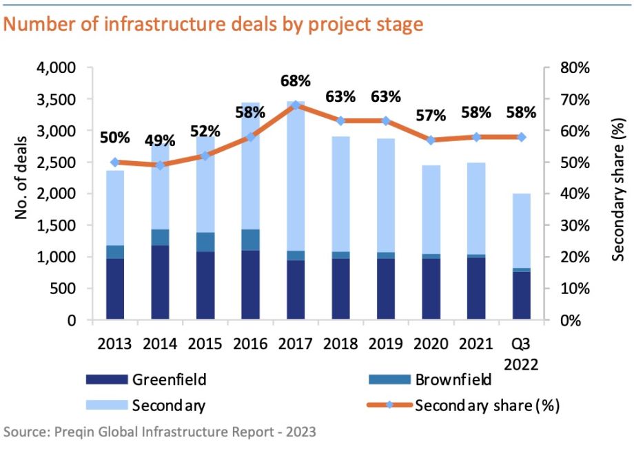 In terms of project stage, secondaries’ share of total deals has waned as greenfield has shown more resilience to falling numbers of deals recently