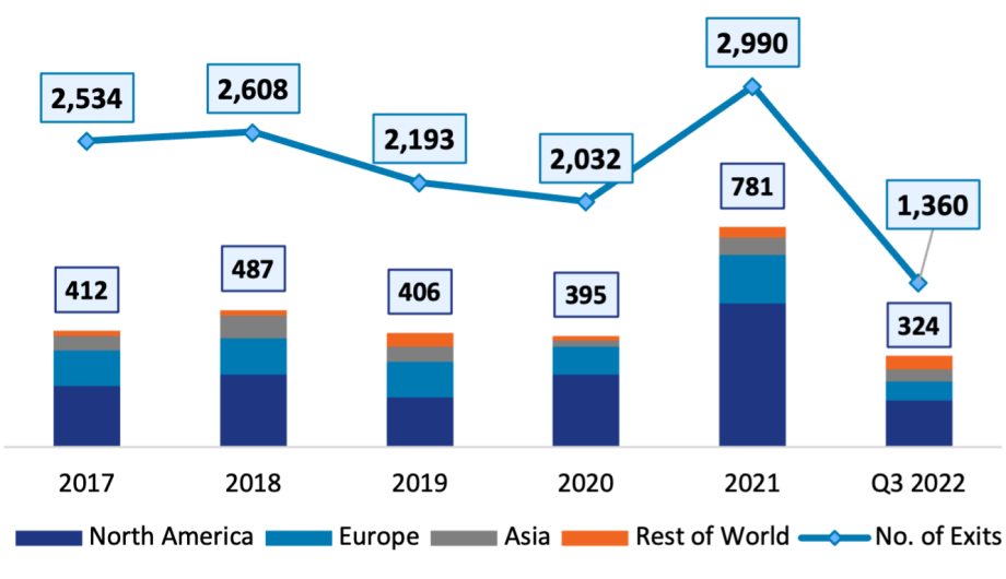 The value of private equity exits declined by 44.7% on an annualized basis in the first nine months of 2022. The aggregate number of exits also declined to 1,360 (or to 1,813, on an annualized basis), significantly lower than pre-pandemic levels.
