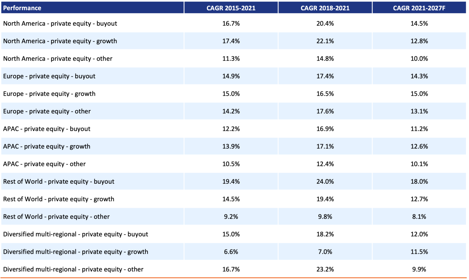 However, this is just over half the 15.4% CAGR recorded between 2017 and 2021, which was driven by a low-interest rate environment, which typically has a more pronounced impact on buyout strategies due to an increased use of leverage.