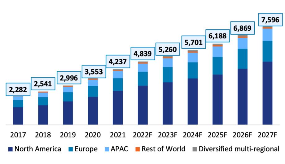 Despite this, global private equity AUM is expected to reach $7.6tn in 2027F, largely driven by growth in North America which is forecasted to make up 63% of global private equity AUM.