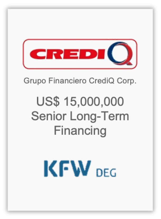 CleanBridge advised CrediQ on a new US$15 million, 6-year, senior term loan from the German development bank (“DEG”), used as long-term financing to supplement the company’s existing funding sources in El Salvador, Honduras, Nicaragua, and Costa Rica.